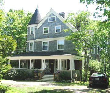 21/2-story, wood-shingled house with a Tuscan-columned veranda and a three-story, conical-roofed, cylindrical tower