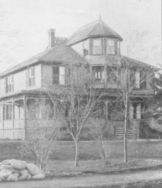 21/2-story, hip-roofed, Shingle Style dwelling with a veranda, a gabled pavilion at the east end of the main facade, and