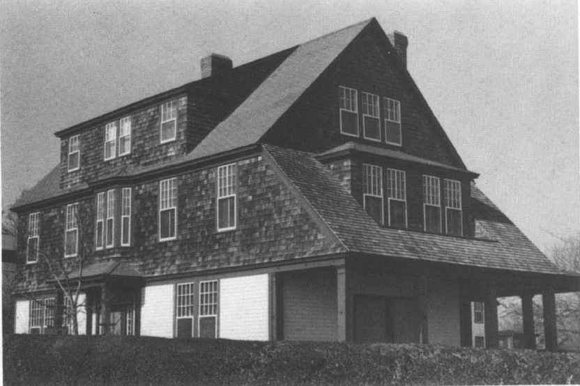 21/2-story Shingle Style bulding with clapboards covering the first floor and shingles above. The flank gable roof contains