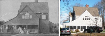 21/2-story Shingle Style dwelling with "Colonial" detailing. It has a gable-roofed front pavilion, with