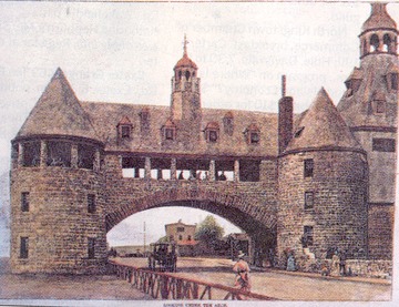 which flank the arch where it springs from the road-side face of the main structure, and the lower